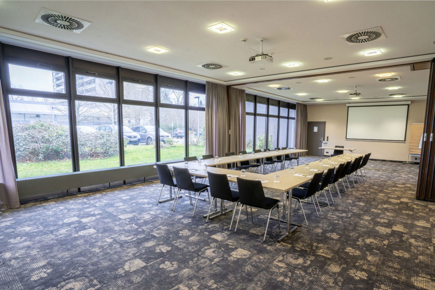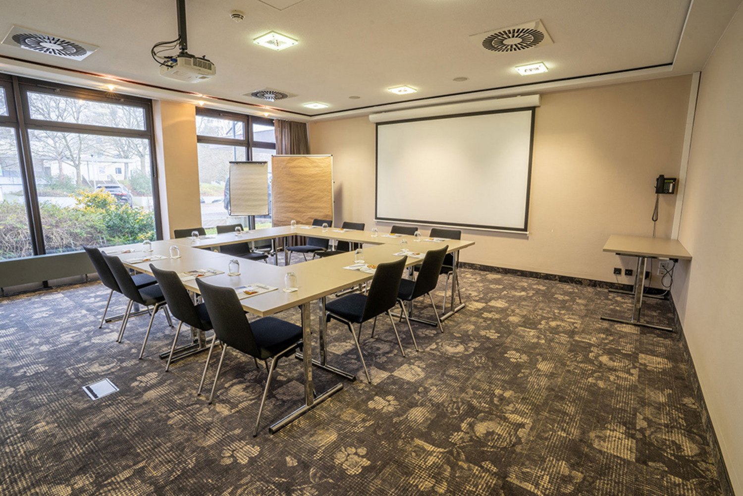 Konferenzraum mit U-förmigem Tisch, Stühlen, Wasser, Schreibmaterial und Projektionsfläche, Tageslicht von Fensterseite.